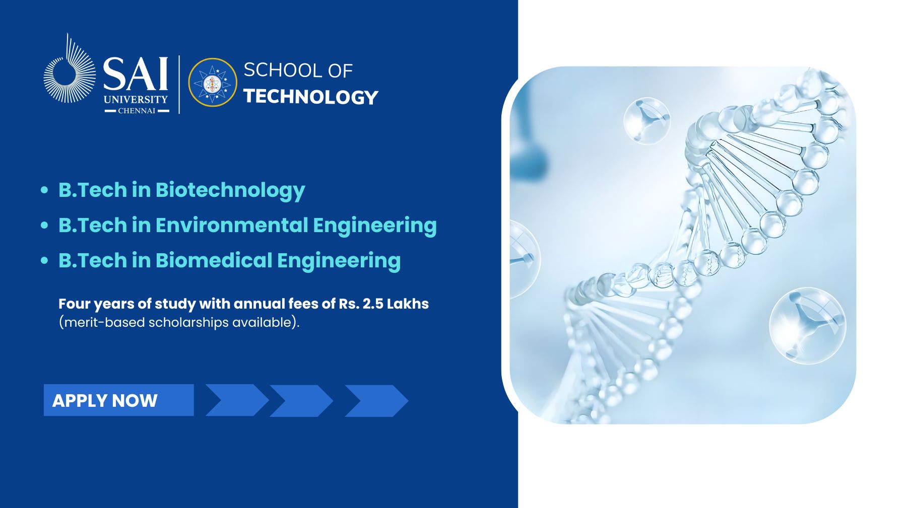 School of Technology at Sai University offers its flagship programs, Bachelor of Technology (B.Tech.) in Biotechnology, Environmental Engineering and Biomedical Engineering. Building on Sai University’s commitment to a multidisciplinary liberal education, the School of Technology aims to empower students with cutting-edge technical expertise combined with a broad understanding of societal and global challenges. Sai U curriculum emphasizes experiential learning through hands-on labs, research opportunities and industry collaborations, enabling students to develop critical thinking, problem-solving, adaptability and leadership skills. The School of Technology is committed to nurturing the next generation of biotech professionals who will drive innovation and make meaningful contributions to science, society and industry.